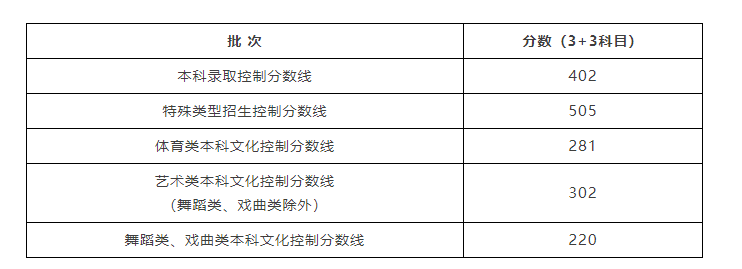 答:在统一高考成绩开通查询的同时,我们公布了本科各批次录取控制分数线,本科录取控制分数线为402分;特殊类型招生控制分数线为505分;艺术类本科文化控制分数线为302分,其中舞蹈类、戏曲类本科文化控制分数线220分;体育类本科文化控制分数线为281分。考生可以结合控制分数线以及本人“3+3”高考成绩,判断自己能否参与本科各批次的志愿填报及录取。